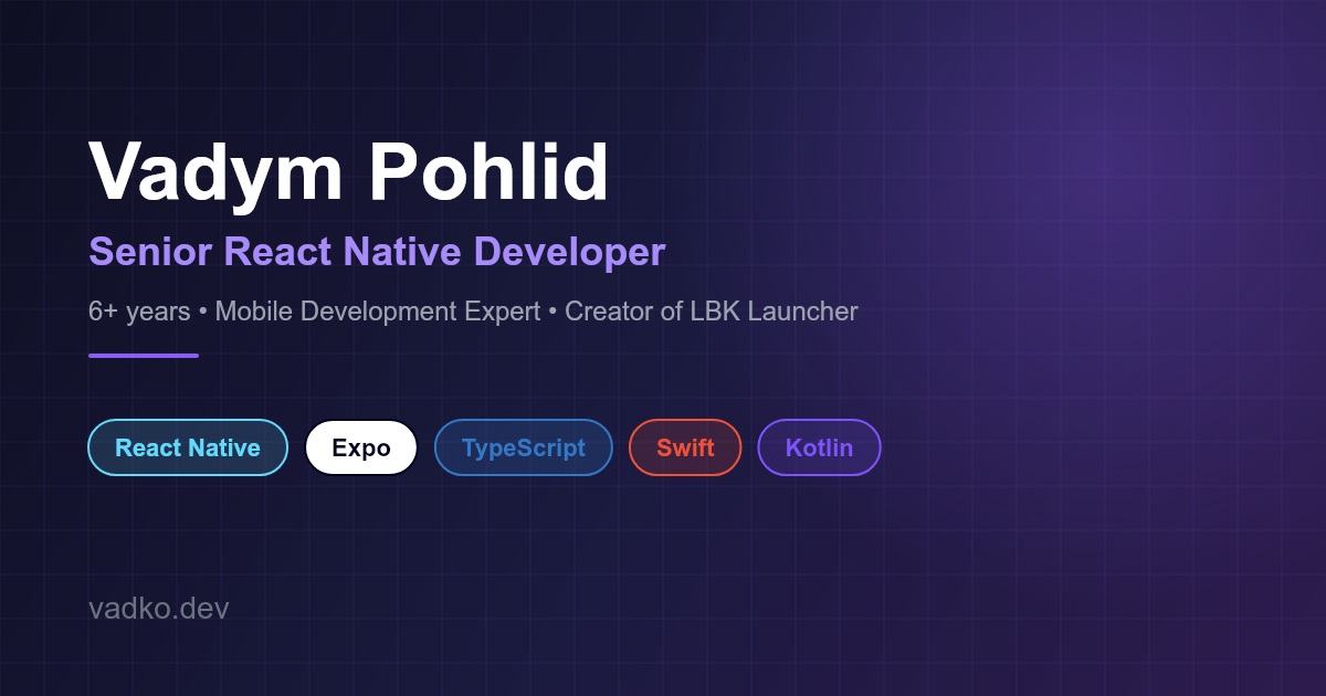 I'm a mobile developer from Ukraine with 6+ years of experience in hybrid mobile development. Expert in React Native, Expo, TypeScript, and delivering crisp UI/UX with Reanimated.